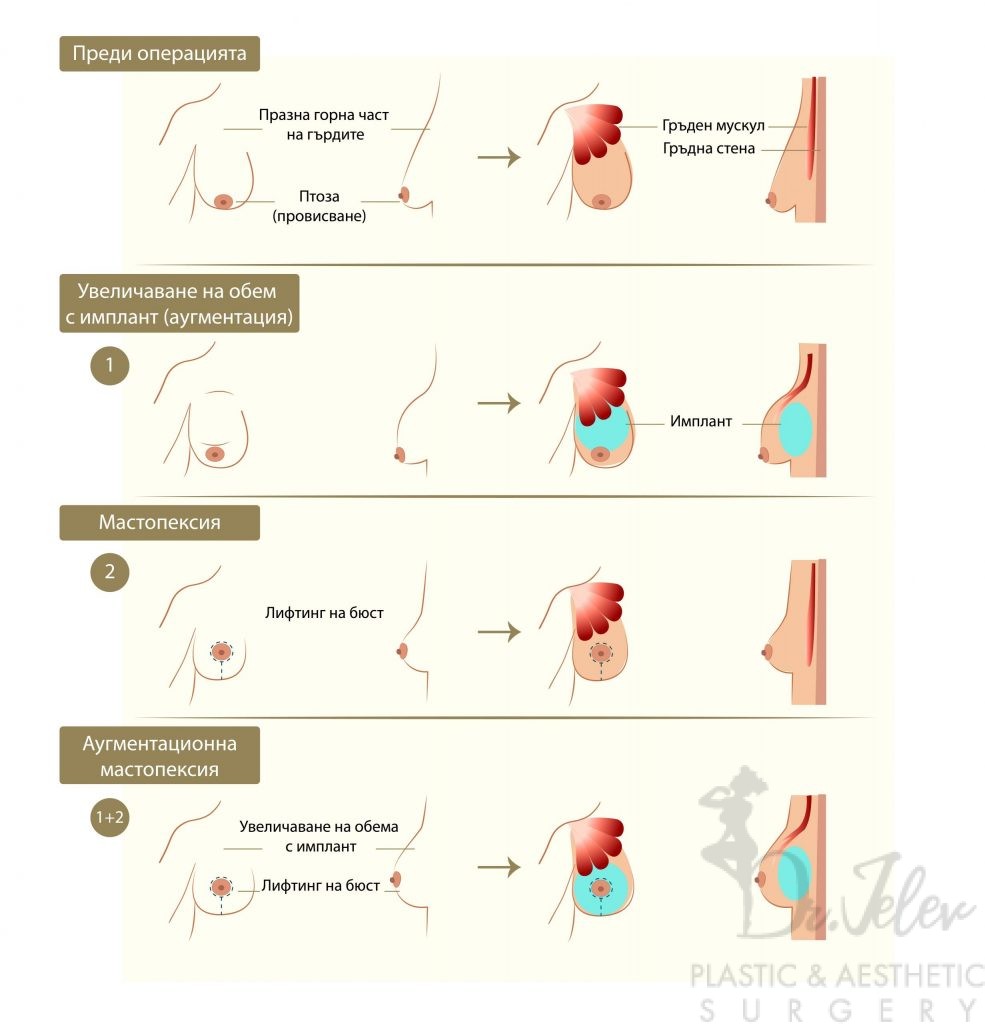 Тази операция включва комбинираното поставяне на имплант за увеличаване обема на бюста (аугментация) и повдигане на гърдите чрез отстраняване на кожния излишък (мастопексия). Прилага се при недостатъчен обем т.е. преобладава предимно отпусната кожа и ограничено „съдържание“ на бюста.